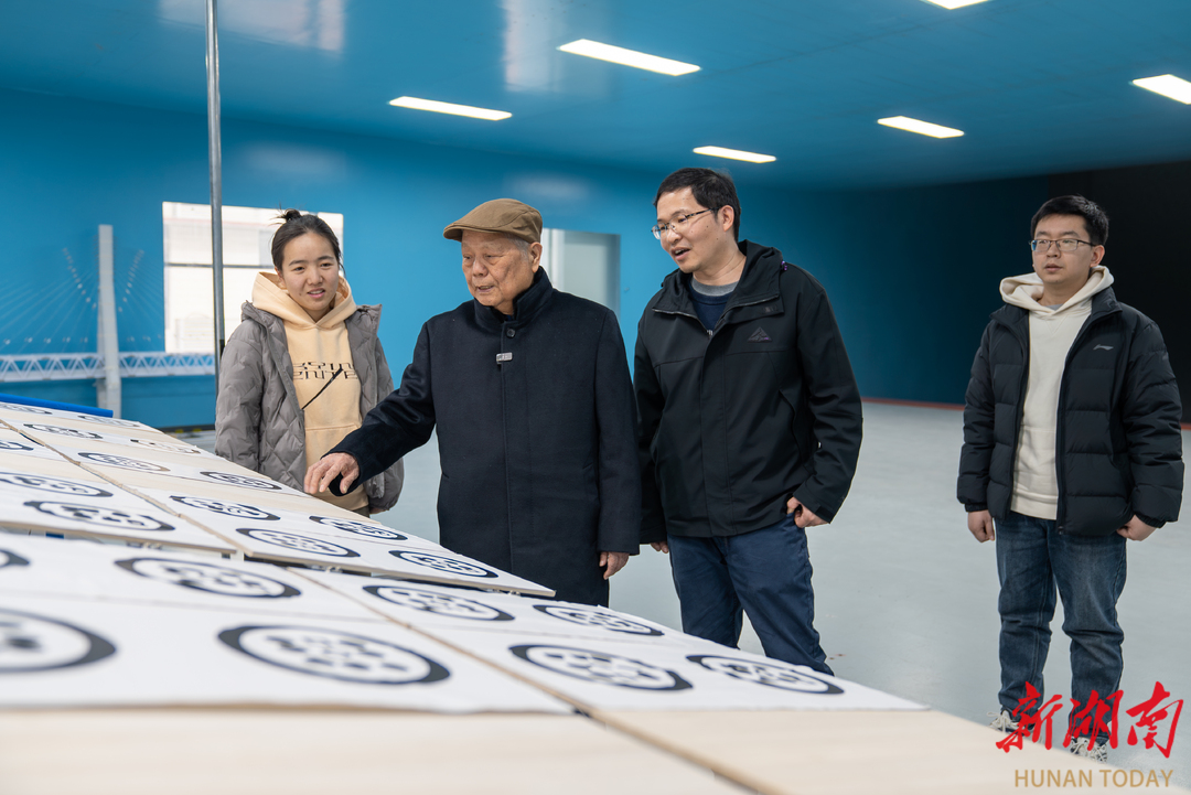 12月12日,中国工程院院士、湖南大学土木工程学院教授陈政清(左二)在桥梁工程安全与韧性全国重点实验室查看实验情况。