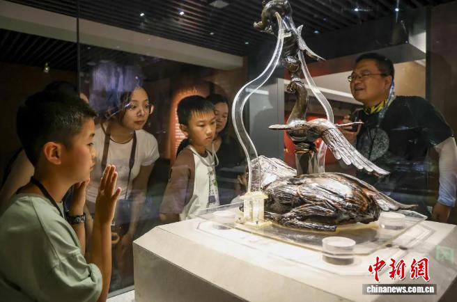 游客在荆州博物馆参观战国时期楚墓出土的漆木彩绘组合器物蟾座凤鸟羽人,由羽人、凤鸟、蟾蜍状器座构成,造型独特,寓意深刻,是构思奇特、想象丰富的艺术珍品。(资料图)张梦瑶 摄