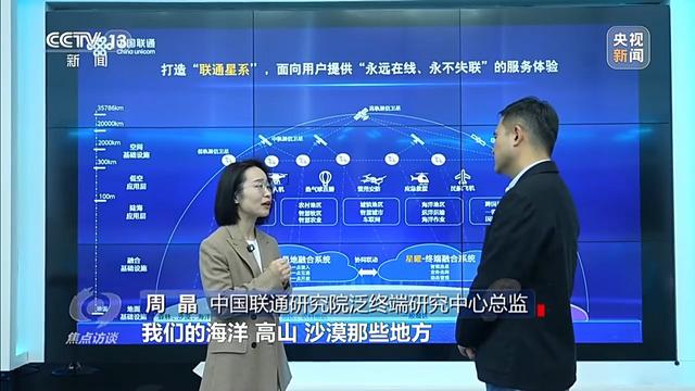 中国联通研究院泛终端研究中心总监 周晶:我们的地面网络覆盖了近50%的范围,还有剩下的50%,我们的海洋、高山、沙漠那些地方,卫星通信就是刚需了。一旦低轨卫星完成了组网,就是一个全球的网络,速率会比较高,因为它的星会比较多,时延也比较小,联网的速度或传业务的速度会更快一些。